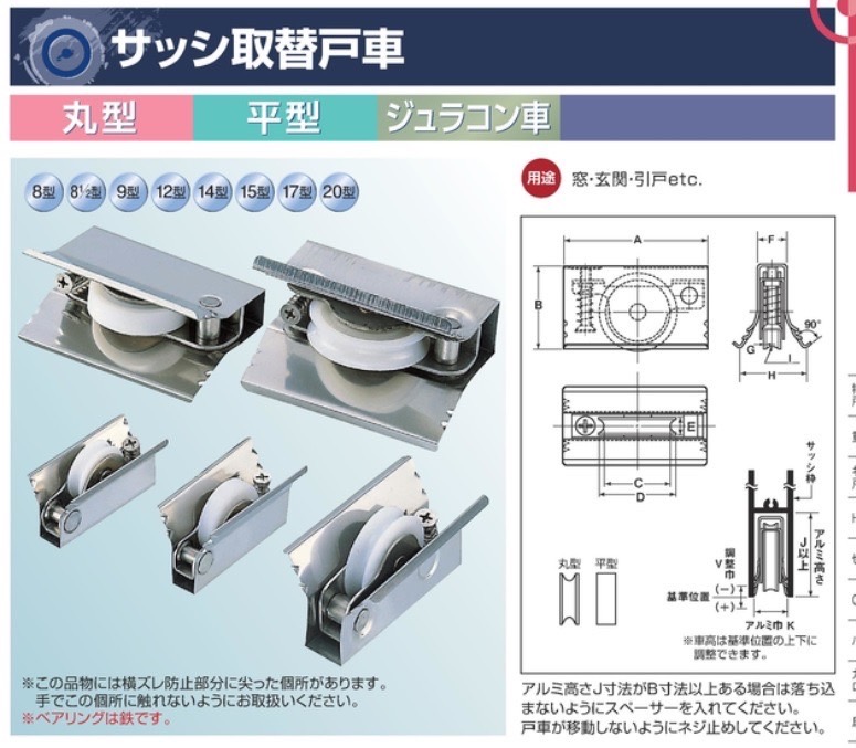 商品名:サッシ取替戸車 「取替戸車」から「取替戸車」に交換する工事をしました。 以前、施工した業者が 施工要領通りに「取替戸車」の取り付けをしてなかった為、ガラスとサッシの重みに耐えられず、戸車が落ち込んだ状態でした。 以下の写真のようにスペーサーを入れて、戸車も新しいものに交換しました。