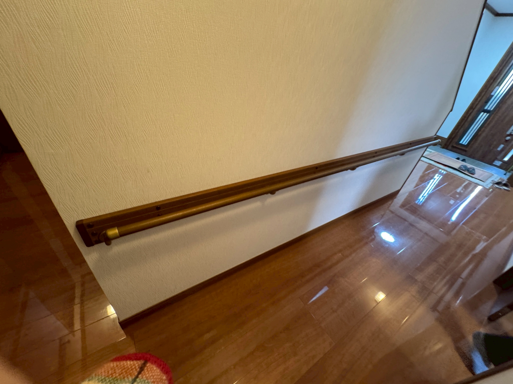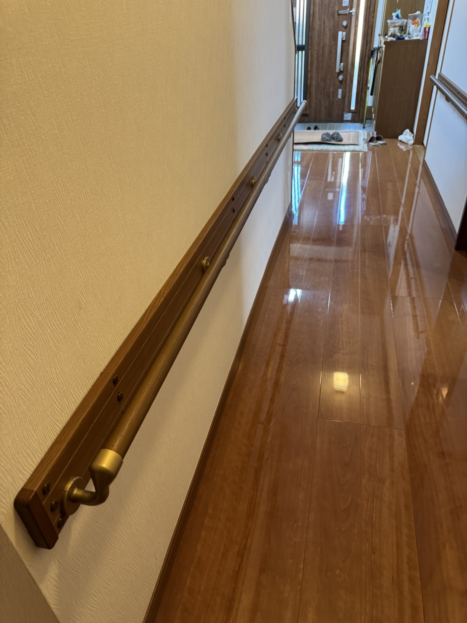工事では、積水ハウスの軽量鉄骨造に詳しい大工を手配し、玄関交換工事のタイミングに合わせて室内手すりの設置を行いました。